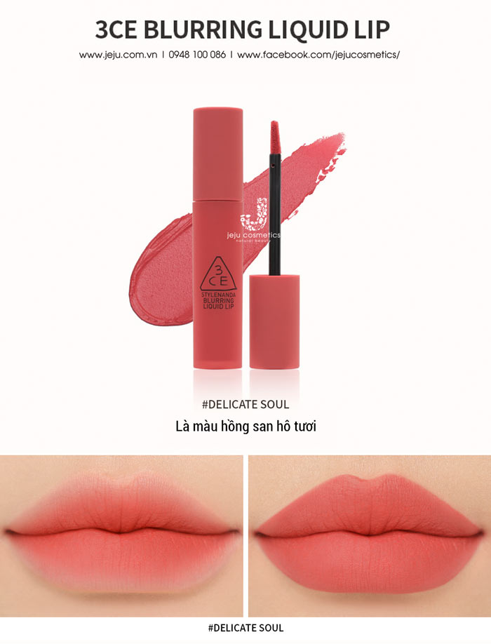 3CE Blurring Liquid Lip Delicate Soul là thỏi son kem lì mịn môi có màu hồng san hô tươi ra mắt vào tháng 8/2020 của 3CE STYLENANDA. Đây là bộ sưu tập son gồm 10 màu son cực xinh và dễ dùng được pha trộn từ những sắc tố nổi bật. Đây là dòng son kem được 3CE mô tả là mịn mượt, không khô có thể che phủ vân môi, lớp finish sắc nét, mờ nhẹ như được phủ một tầng phấn mỏng.