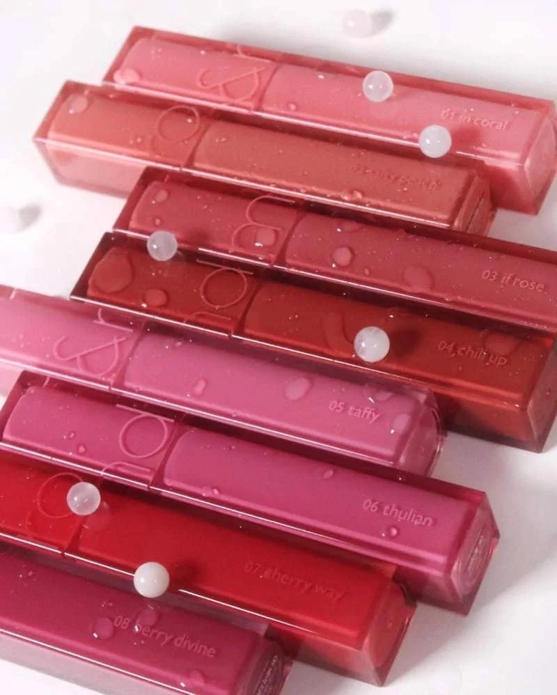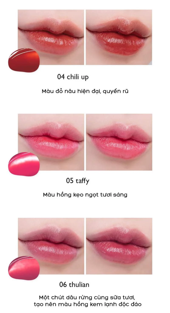 - Về kết cấu, son có kết cấu đặc biệt với lớp bóng trong suốt tách biệt với lớp tint, tạo cảm giác lớp bóng trong suốt như nước, tựa giọt sương bóng sáng, trong trẻo đọng trên bờ môi bạn.